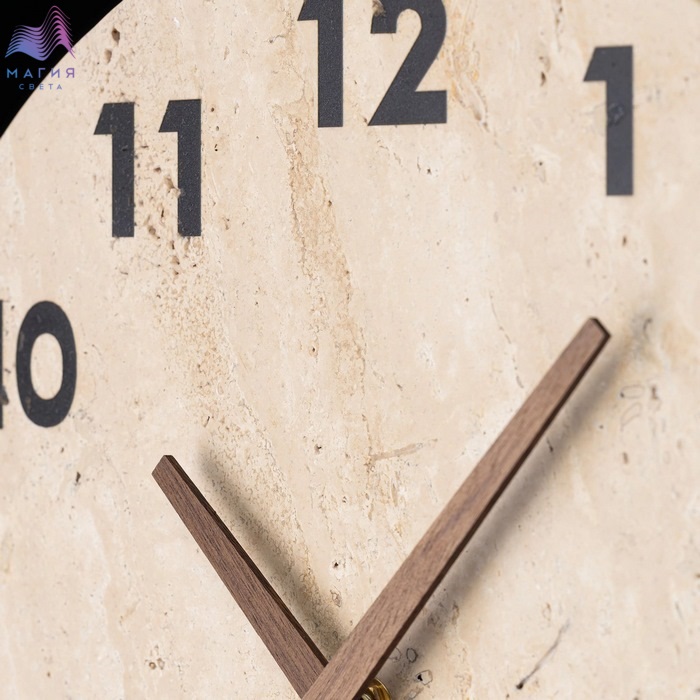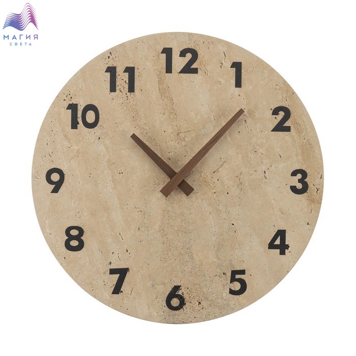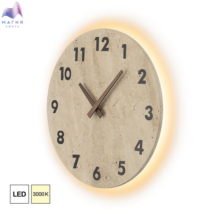 Часы с подсветкой Citilux Mares CL246016. Арматура металлическая, корпус — круглой формы, из натурального камня травертина бежевого оттенка. Стрелки у часов деревянные, цифры нарисованы черной краской, часы работают от одной батарейки АА.