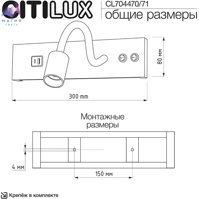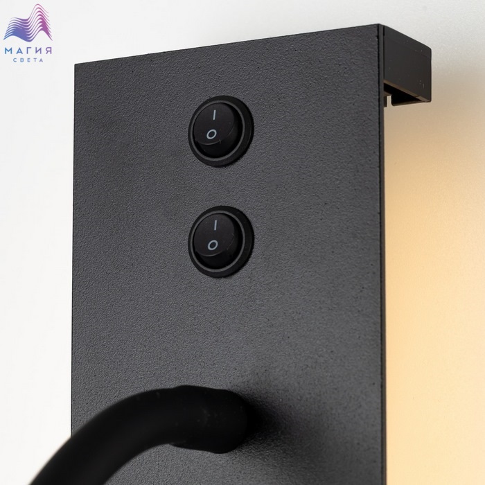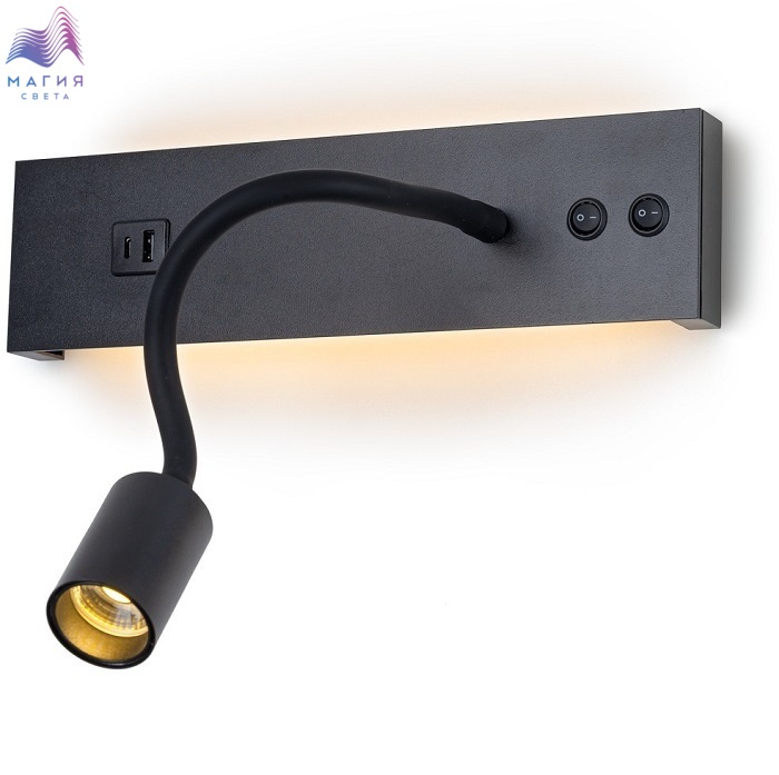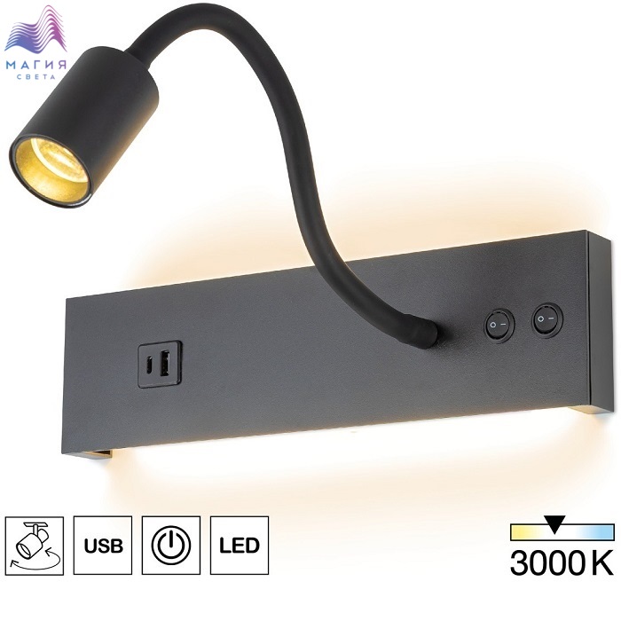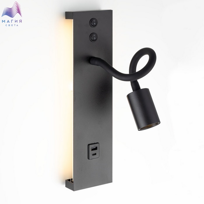 Настенный светодиодный светильник для чтения Citilux Dekart CL704471. Материал: металл, цвет: черный. Фоновая подсветка основания - вверх и вниз, поворотная подсветка на гибкой ножке для чтения. Каждый источник света оснащен отдельным выключателем. Установка светильника возможна в вертикальном или горизонтальном положении с ориентацией вправо или влево. На корпусе расположено зарядное устройство для мобильных устройств, разъёмы USB и Type-C, ток зарядки 1,5А.