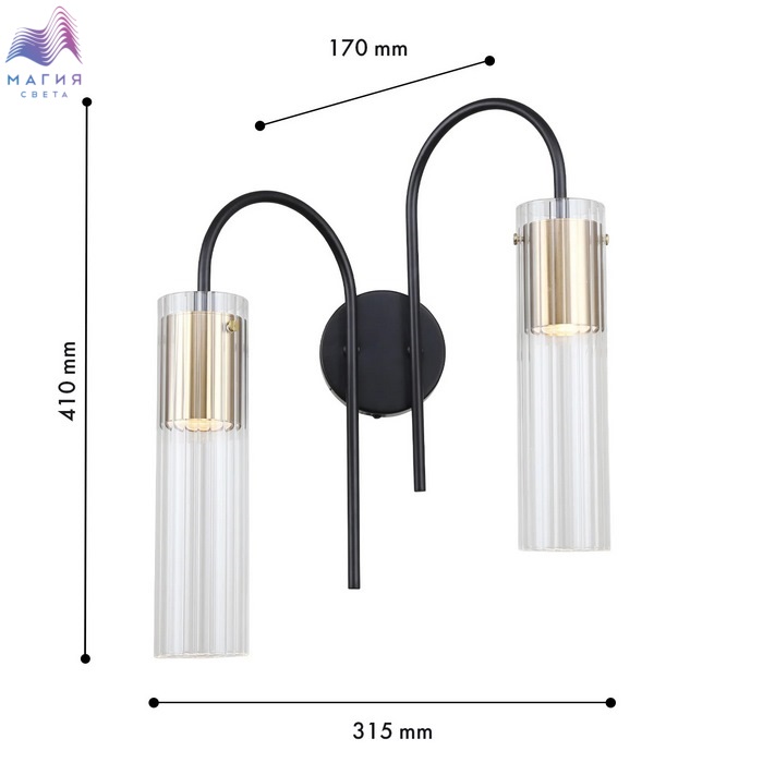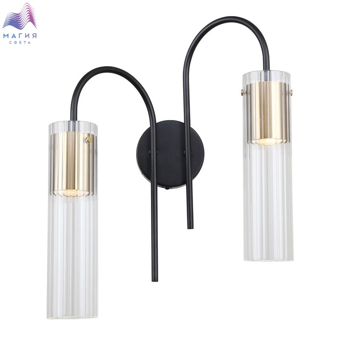 Потолочная люстра и бра из серии Favourite Kors отличаются необычным дизайном. Металлический каркас выкрашен в черный цвет. Золотые металлические элементы обрамлены прозрачными цилиндрическими плафонами.
