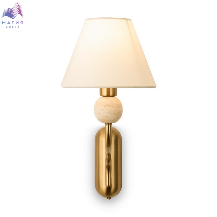 Серия Freya Aurelia состоит из люстры и бра с белыми тканевыми абажурами, которые мягко рассеивают свет. Металлическая арматура, выполненная в тёплом оттенке латуни, гармонично сочетается с природной текстурой травертина.