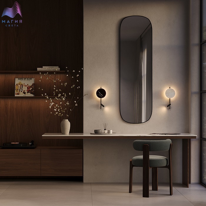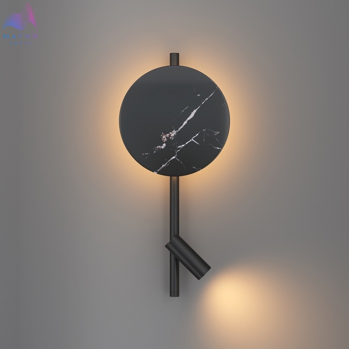Серия настенных светильников Maytoni Solution. Диск из натурального дерева или мрамора (чёрного и белого) служит не только декоративным элементом, но и частью световой системы с встроенным LED-источником (3000К). Второй источник света — поворотный спот — позволяет точно направлять свет. Углы вращения 350° по горизонтали и 90° по вертикали. Сенсорный выключатель на корпусе позволяет управлять каждым источником по отдельности или вместе, а также плавно регулировать интенсивность светового потока (диммирование).