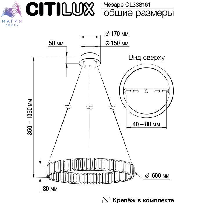 Хрустальный светодиодный светильник Citilux Чезаре CL338161. Материал: металл/хрусталь. Цвет: хром/прозрачный. Хрустальное кольцо на металлическом каркасе, подвешено на элегантных тросиках и словно парит в воздухе. Высота подвесной модели легко регулируется в диапазоне от 35см до 1,35м. Площадь освещения - до 18м².