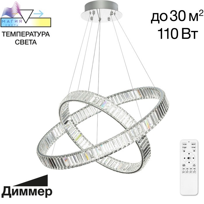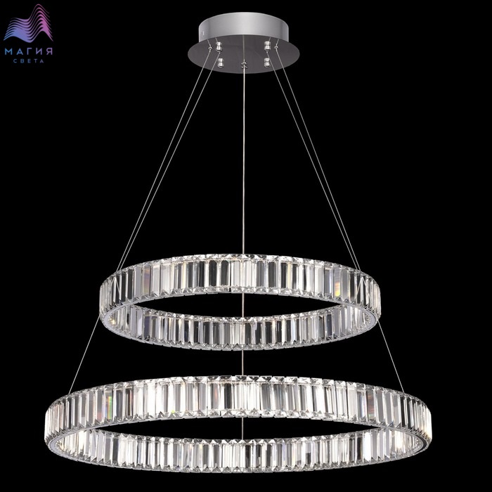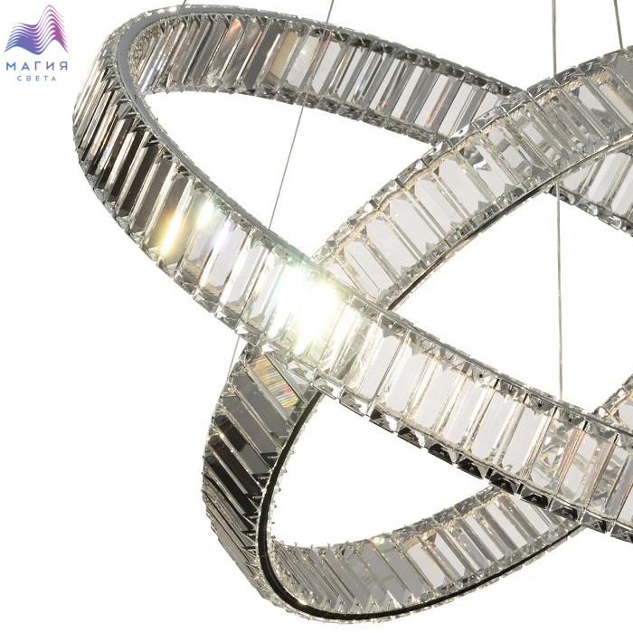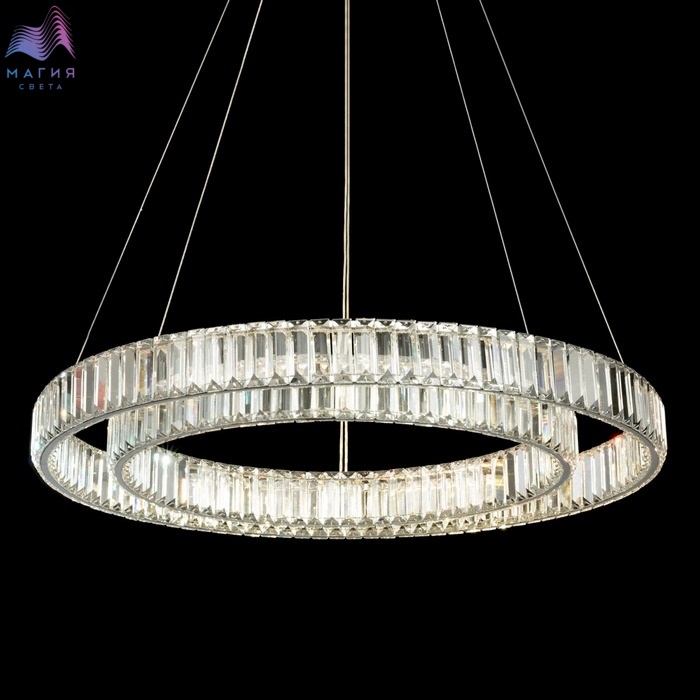 Хрустальный светодиодный светильник Citilux Чезаре CL338281. Материал: металл/хрусталь. Цвет: хром/прозрачный. Два хрустальных кольца на металлическом каркасе, подвешены на элегантных тросиках и словно парит в воздухе. Высота подвесной модели легко регулируется в диапазоне от 40см до 1,5м. Площадь освещения - до 30м².