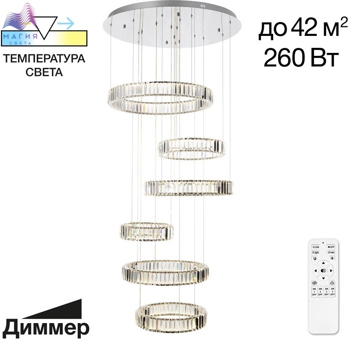 Хрустальный светодиодный светильник Citilux Чезаре CL338661. Материал: металл/хрусталь. Цвет: хром/прозрачный. Шесть хрустальных колец на металлическом каркасе, подвешены на элегантных тросиках и словно парит в воздухе. Высота подвесной модели легко регулируется в диапазоне от 80см до 2,3м. Площадь освещения - до 42м².