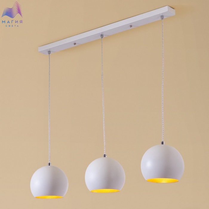 Тройной подвесной светильник Citilux Оми CL945130. Материал: металл. Цвет: матовый белый. Плафоны в форме усечённого шара с оригинальным цветовым решением. Внешняя часть плафона белая, внутренняя золотистого цвета. Высота легко регулируется от 30см до 1,2м.