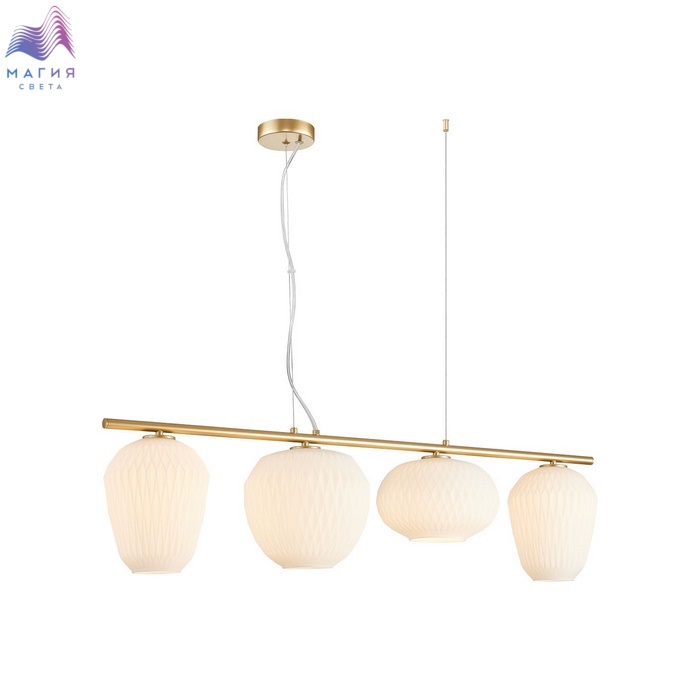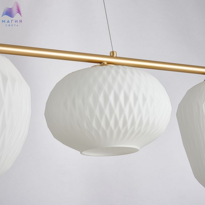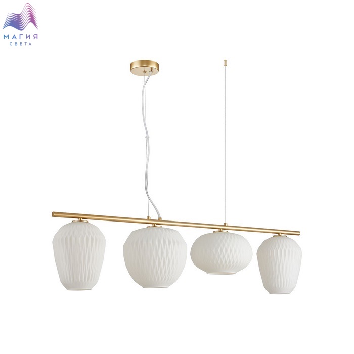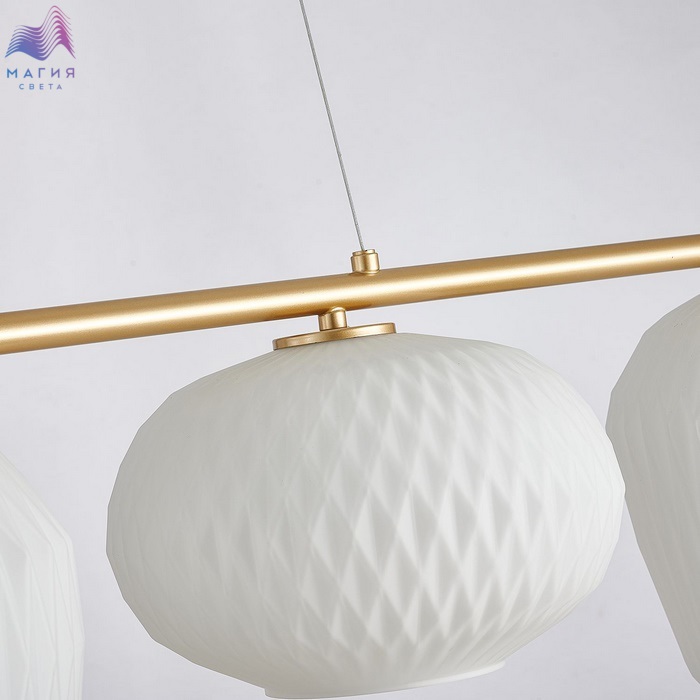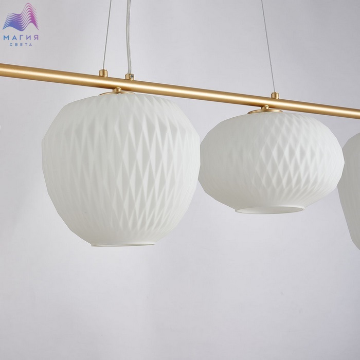 Подвесные светильники Favourite Comical прекрасно подходят для освещения стола в обеденной или рабочей зонах. К металлической конструкции матового золотого цвета прикреплены объемные и разные по форме плафоны из белого или прозрачного стекла. Высота тросов регулируется при монтаже.