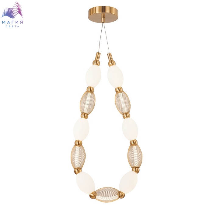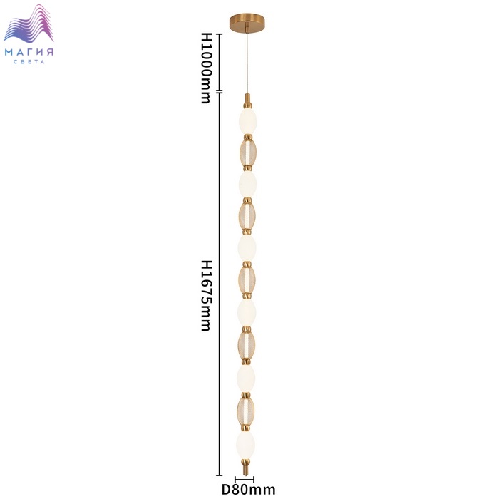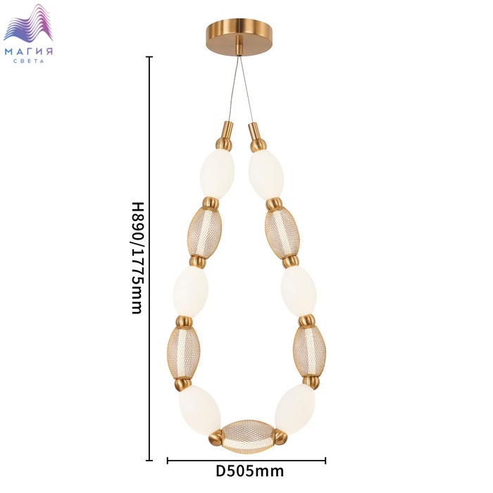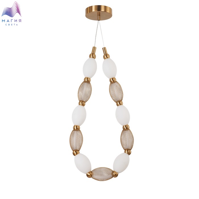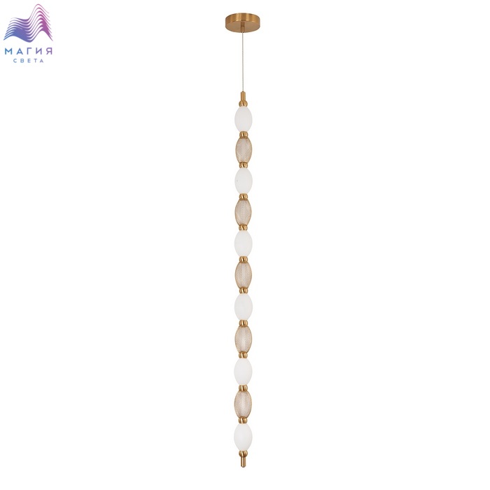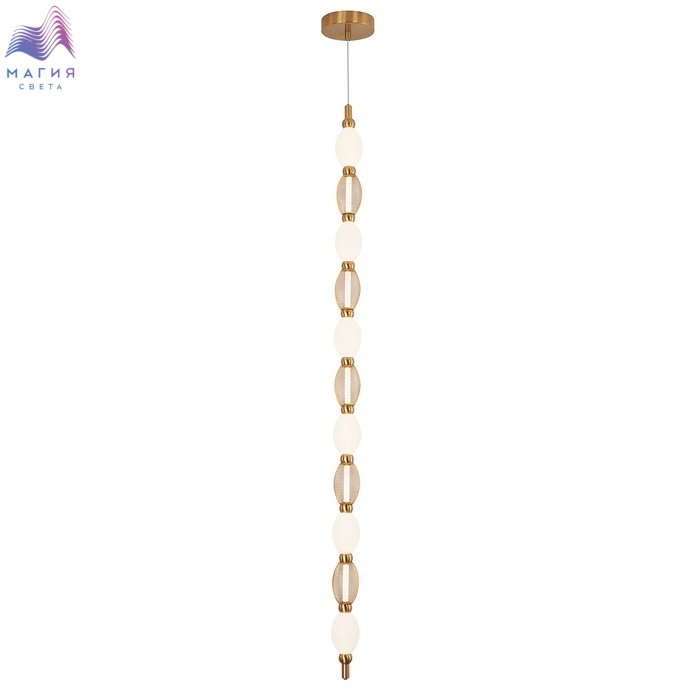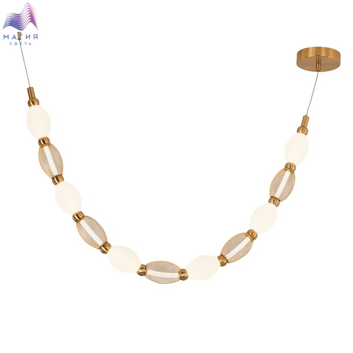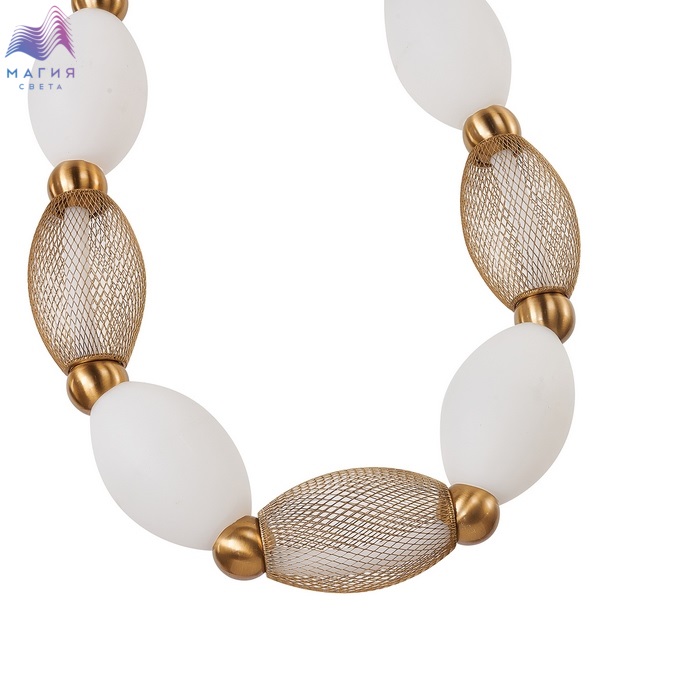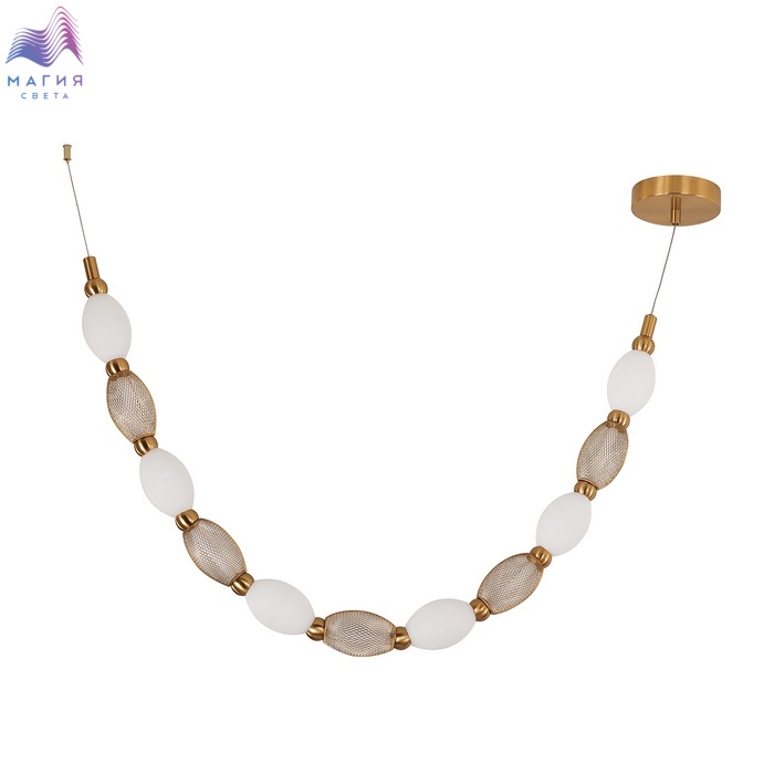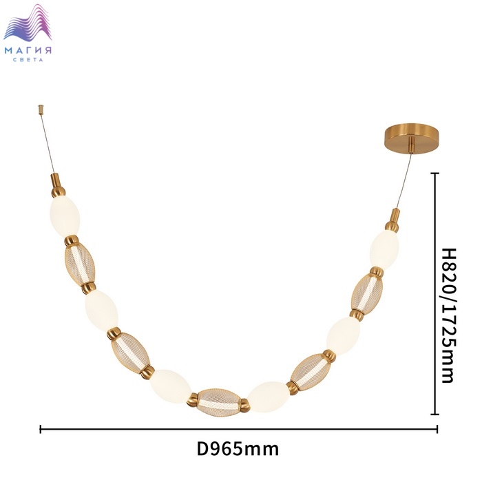 Основой конструкции служит гибкая силиконовая трубка со встроенной лентой LED. На эту трубку нанизаны плафоны из белого акрила и декоративной металлической сетки. Цвет каркаса - античная бронза. Варианты крепления: на потолок, стены, включая вариант с фиксацией от потолка до пола. Размеры светильника меняются, в зависимости от способа крепления: D965*H820/1725; D505*H890/1775; D160*H1780/2780.