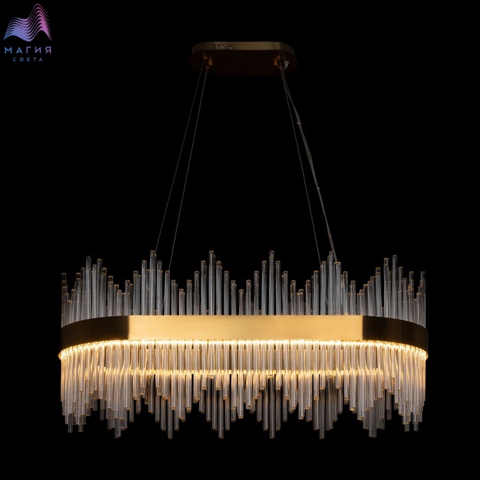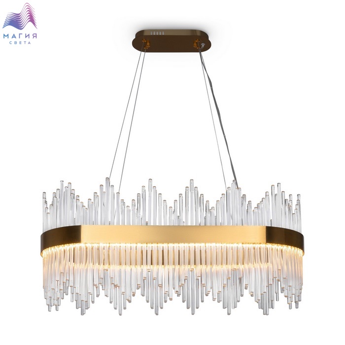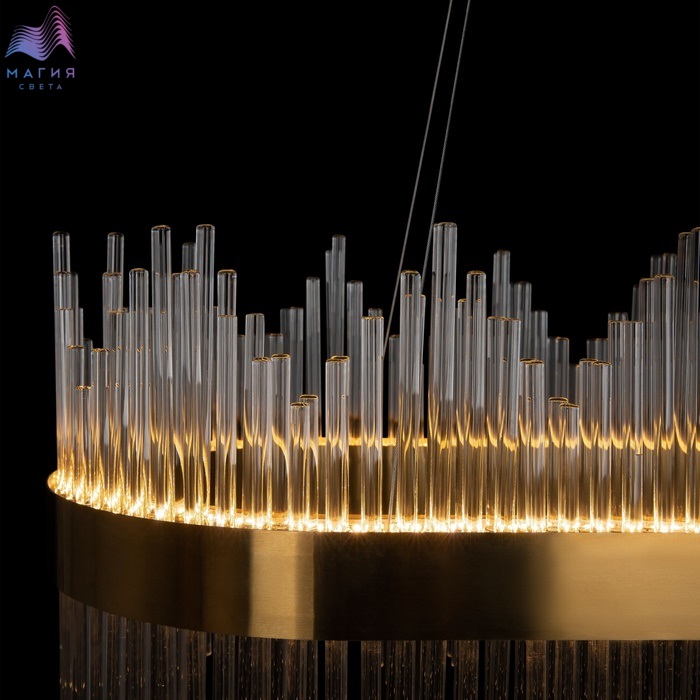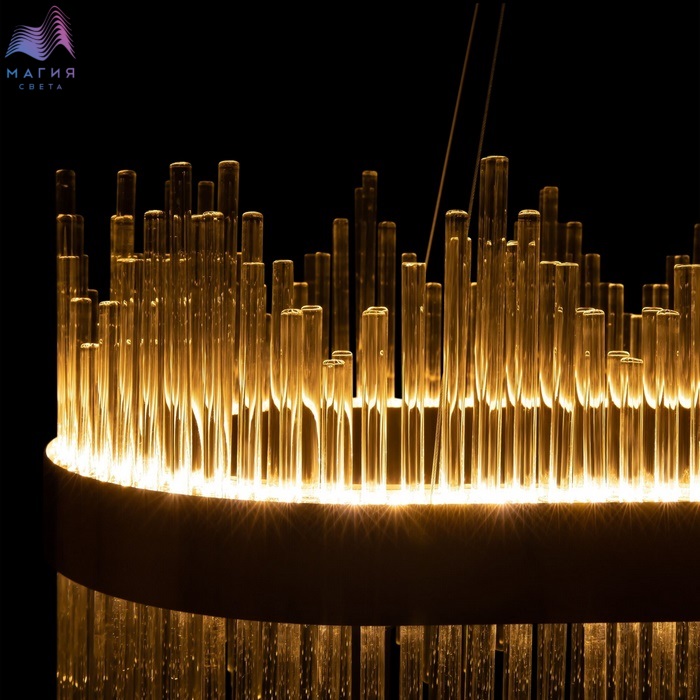 Серия Freya Chalice повторяет форму струящегося водопада света. Симметрично расположенный декор создает динамичный рисунок переливающихся волн, а лучи света, преломляясь в стеклянной поверхности, подчеркивают иллюзию движения. Металлическая арматура окрашена в золотой оттенок. Визуально незаметные тросы поддерживают идею невесомости композиции, а LED-источники света обеспечивают яркое освещение. Три подвесные люстры различного диаметра и мощности позволяют выбрать оптимальный вариант с учетом размеров помещения.