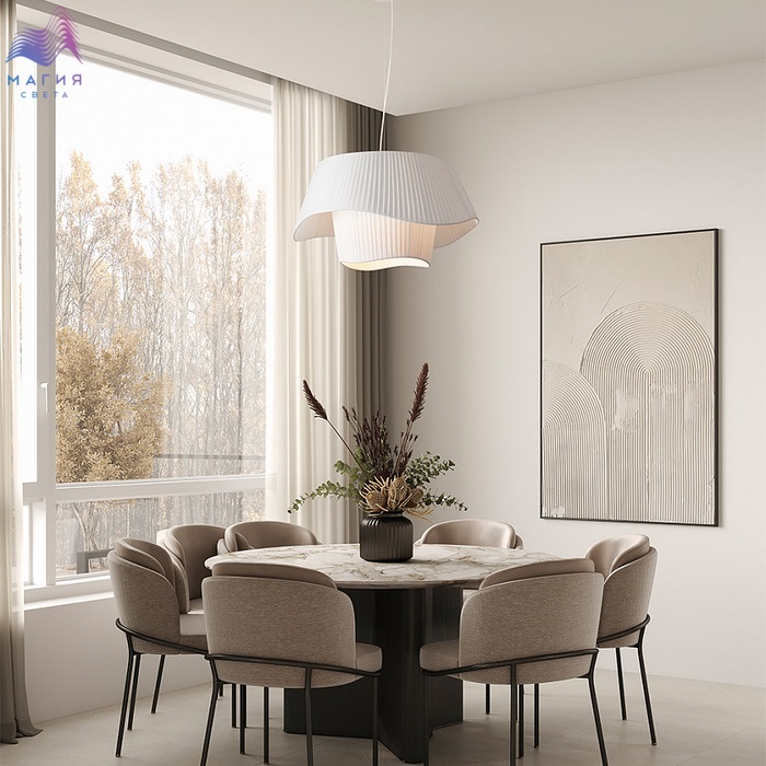 Подвесной светильник серии Freya Air смотрится легко и воздушно и полностью оправдывает свое название. Объемный абажур изготовлен из белой ткани. Потолочное основание окрашено белой краской.