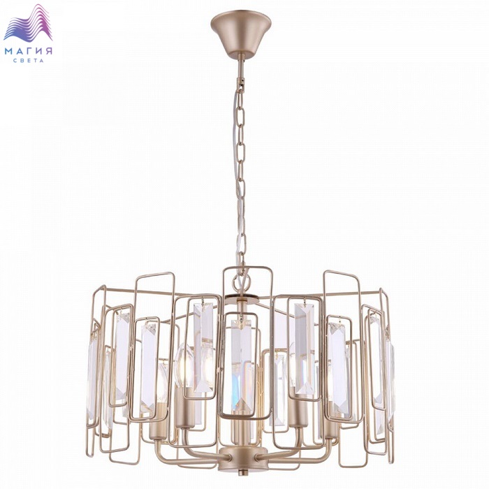Подвесной светильник Freya Rowena FR5045PL-05G окрашен в матовый золотой цвет. Данная модель отлично впишется как в классический, так и современный интерьеры. Металлический каркас дополнен крупными хрустальными пластинами, которые создают неповторимый блеск.