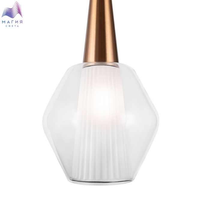 напоминая о ретро-стилистике. Оригинальные двойные плафоны выполнены из стекла, внутренняя часть представлена в двух вариантах: с фактурной рельефной поверхностью и матовой гладкой. Сложная геометрическая фигура обрамляет конус, подчеркивая трендовый дизайн. Серия Freya Copita состоит из двух подвесов, предназначенных для комфортного зонального освещения.