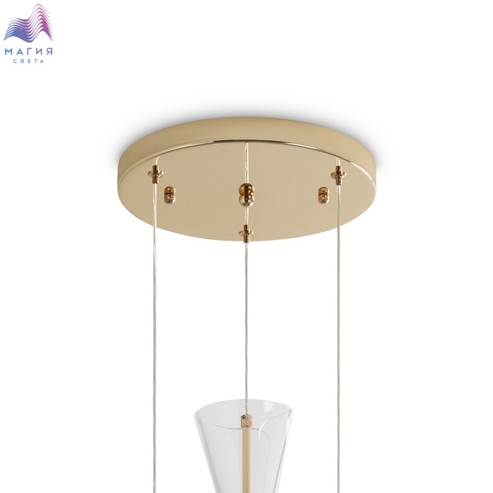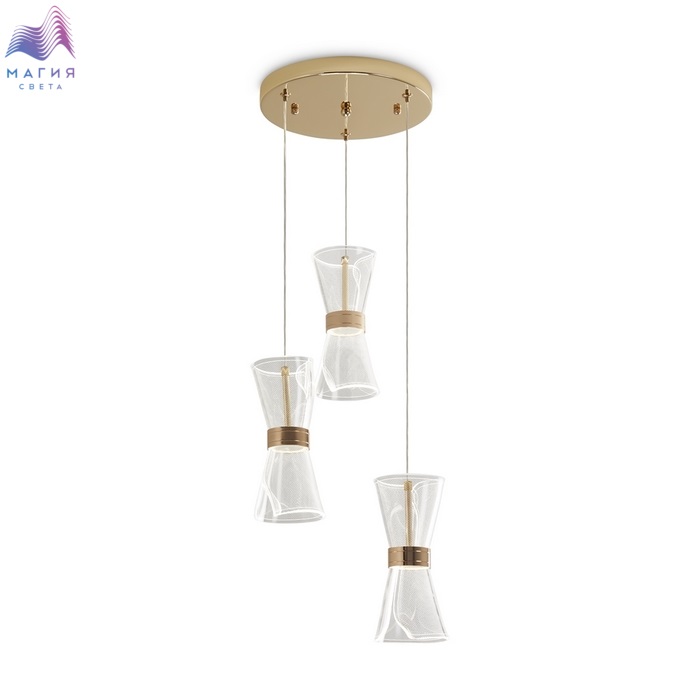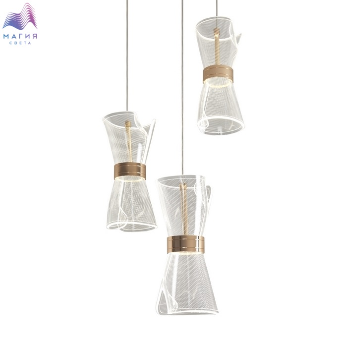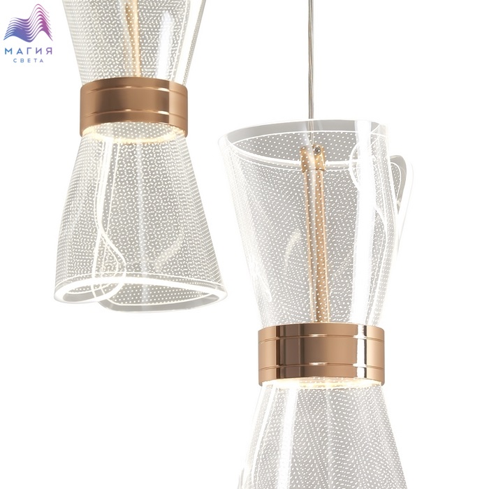 Декоративные подвесы и каскады серии Freya Dress — воплощение элегантности. Плафоны из акрила исполнены в форме песочных часов и декорированы золотой окантовкой. Длину провода можно регулировать при монтаже.