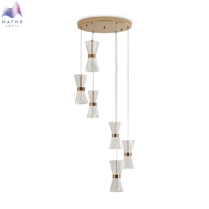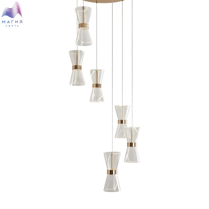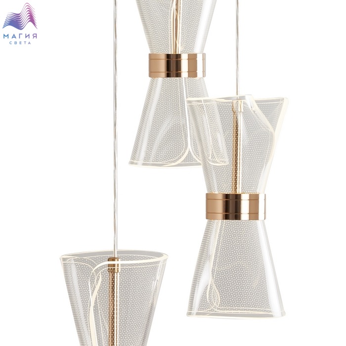 Декоративные подвесы и каскады серии Freya Dress — воплощение элегантности. Плафоны из акрила исполнены в форме песочных часов и декорированы золотой окантовкой. Длину провода можно регулировать при монтаже.
