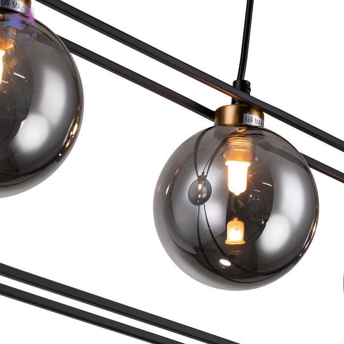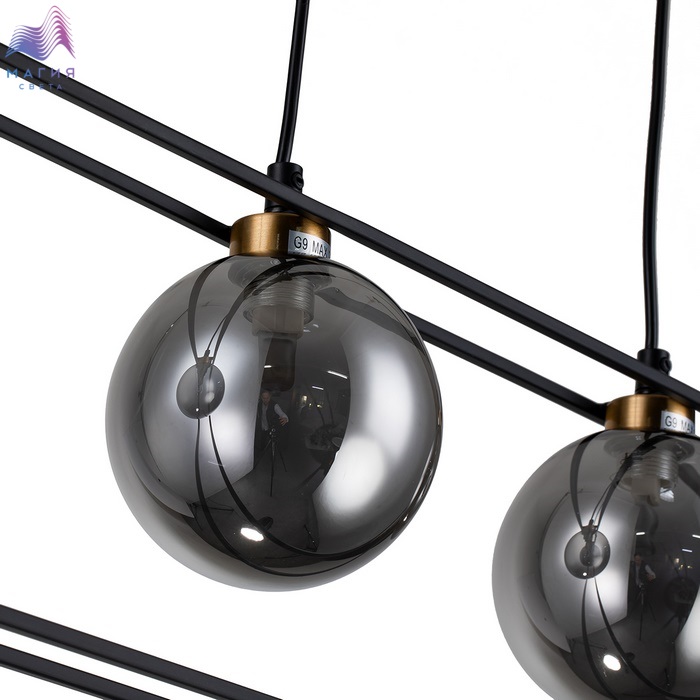 Плафоны светильников, выполненные из дымчатого стекла, объединенные золотой и черной фурнитурой, станут прекрасным дизайнерским решением.