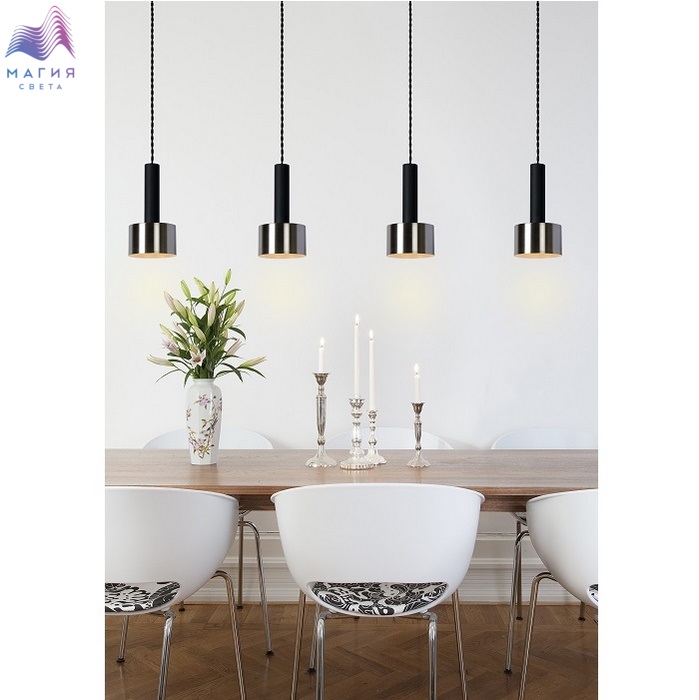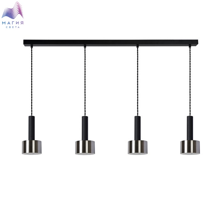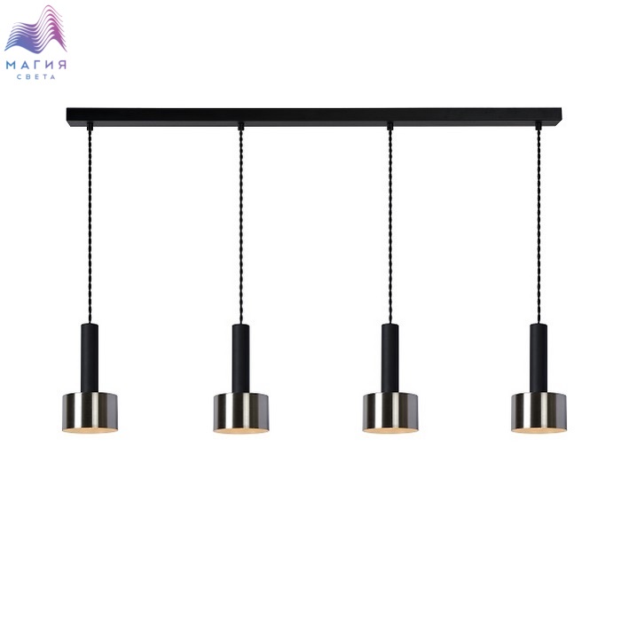 Подвесные светильники Lucide Teun представлены в двух вариантах: на 1 и 4 плафона. Их ретро-дизайн удачно вписывается и в современнный, и в индустриальный стиль. Провод текстильный, черного цвета. Абажуры выполнены из прочного металла стального цвета и дополнены черными цилиндрами.