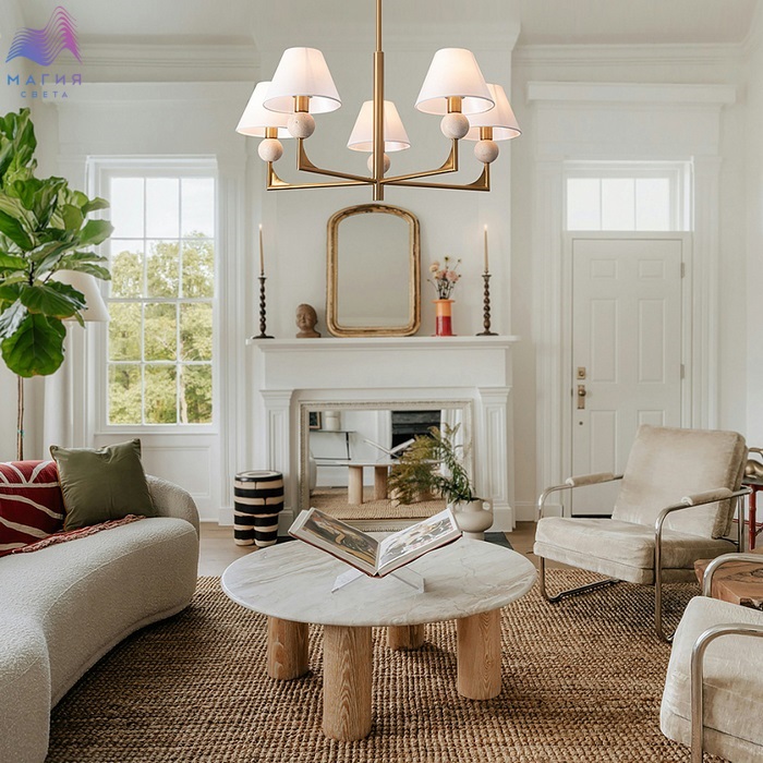 Очаровательная коллекция Freya Riley прекрасно впишется в классический интерьер спальни, гостиной или прихожей. Металлический каркас латунного цвета декорирован сферическими деталями, выполненными из камня. Плафоны изготовлены из плотной белой ткани.