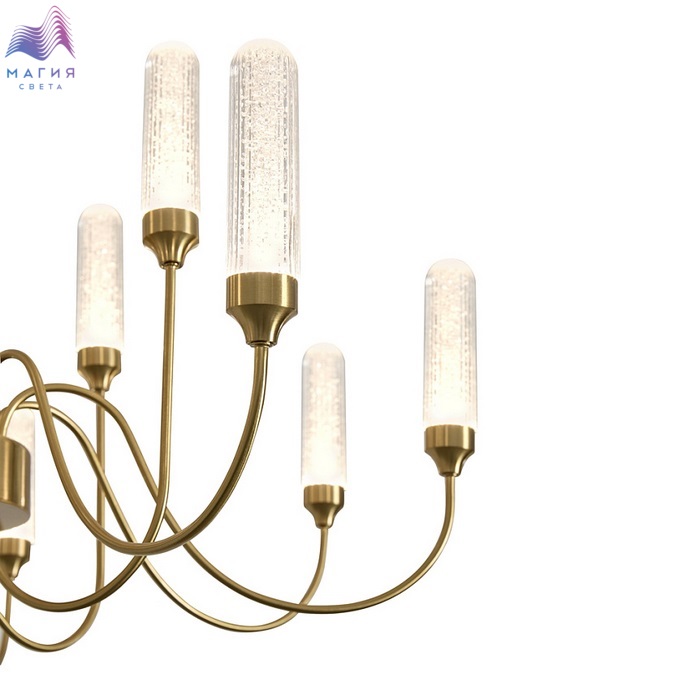 Серия Freya Alias состоит из двух вариантов люстр. Цвет металла — латунь и никель. Основной акцент в дизайне сделан на акриловые плафоны с эффектом пузырьков: они мягко рассеивают свет и создают лёгкую игру бликов. В качестве источника света используются встроенные LED-модули.