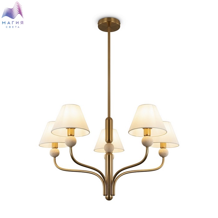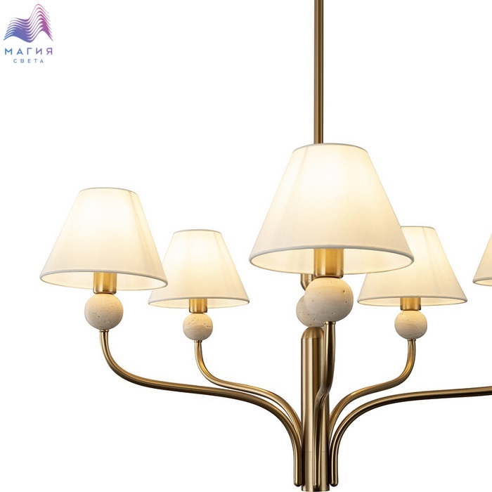 Серия Freya Aurelia состоит из люстры и бра с белыми тканевыми абажурами, которые мягко рассеивают свет. Металлическая арматура, выполненная в тёплом оттенке латуни, гармонично сочетается с природной текстурой травертина.