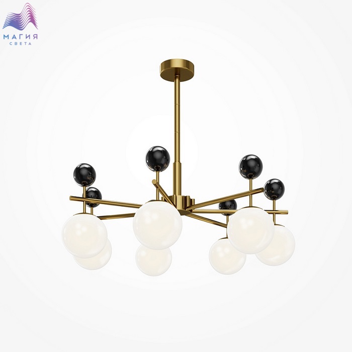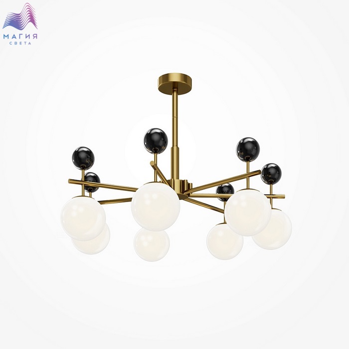 Серия Maytoni Museo является воплощением элегантности. Строгий металлический каркас латунного цвета декорирован сферическими деталями, изготовленными из черного камня. Плафоны также сферической формы завершают образ, создавая мягкое свечение. В коллекции представлены потолочная люстра на 5 плафонов и бра.