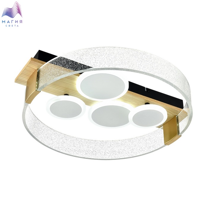 Черное металлическое потолочное основание Сонекс Spots сочетается с декоративным основанием из МДФ цвета натурального дерева. Оно, в свою очередь, сочетается с прозрачным акриловым рассеивателем и белыми окружностями со светодиодными контурами. Светильник оснащен пультом ДУ.