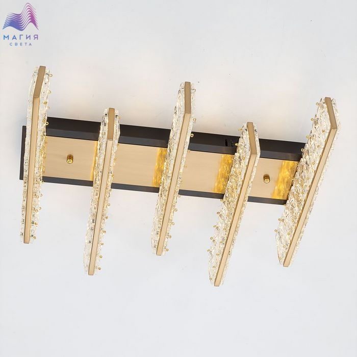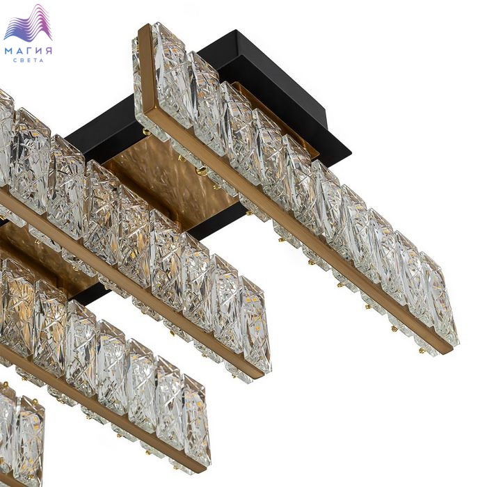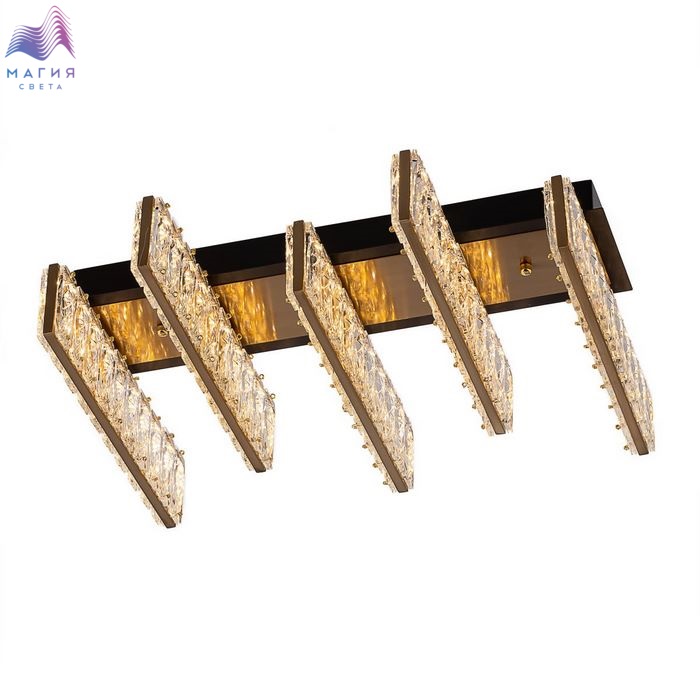 Хрустальный потолочный светильник Citilux PALANT CL325252. Материал: металл/хрусталь. Цвет: черный/бронза/прозрачный. На прямоугольном основании закреплены пять горизонтальных светодиодных модулей с хрустальным рассеивателем. Светодиодный свет с цветовой температурой 3000К мягко рассеивается в пространстве.