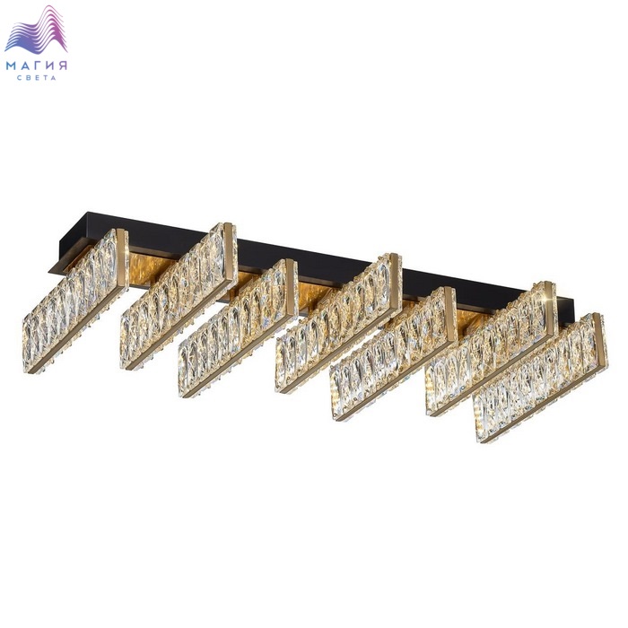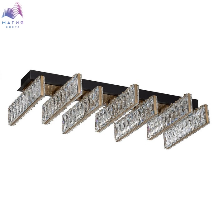 Хрустальный потолочный светильник Citilux PALANT CL325272. Материал: металл/хрусталь. Цвет: черный/бронза/прозрачный. На прямоугольном основании закреплены пять горизонтальных светодиодных модулей с хрустальным рассеивателем. Светодиодный свет с цветовой температурой 3000К мягко рассеивается в пространстве.