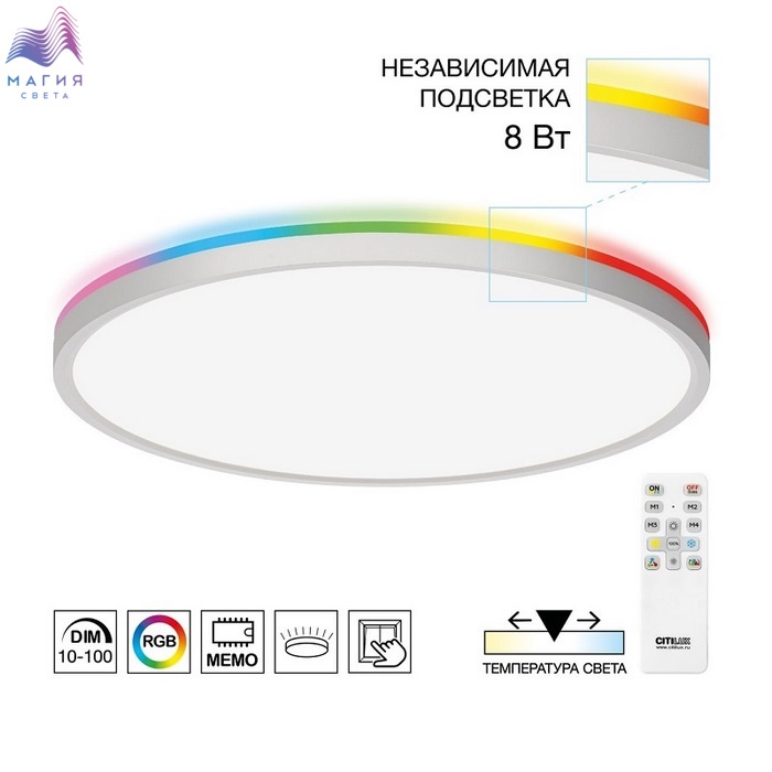 Потолочный светодиодный светильник Citilux NORMA CL749400. Материал: полимер. Цвет: белый. Модель оснащена двумя светодиодными модулями – основного света и красочной потолочной RGB подсветки. Пульт ДУ в комплекте (плавная регулировка яркости от 10 до 100%; управление цветовой температурой от 3000К до 5500К, цветная RGB подсветка). Площадь освещения - до 17м².