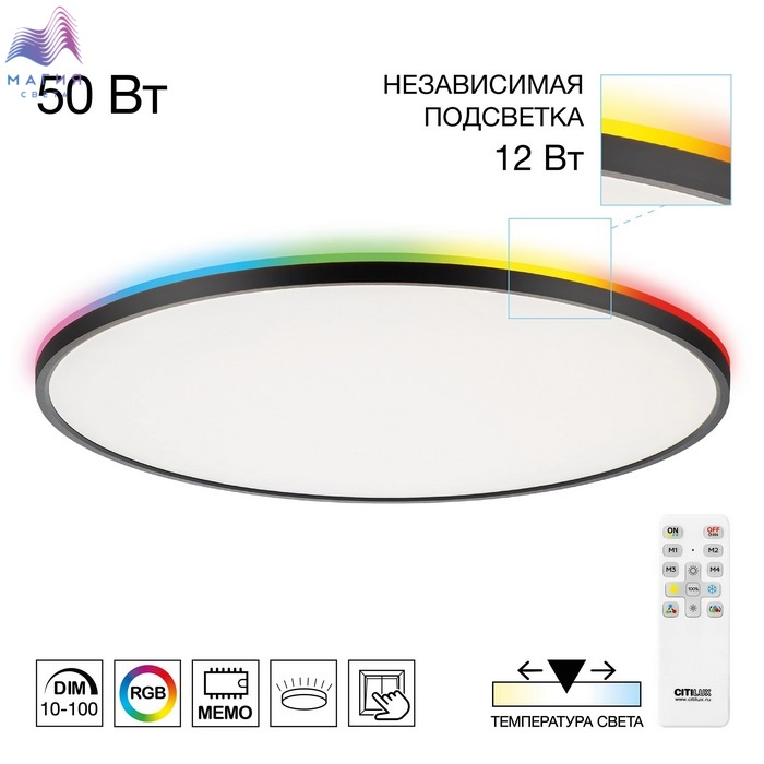 Потолочный светодиодный светильник Citilux NORMA CL749601. Материал: металл/пластмасса. Модель оснащена двумя светодиодными модулями – основного света и красочной потолочной RGB подсветки. Пульт ДУ в комплекте. Регулировка яркости от 10 до 100%; управление цветовой температурой от 3000К до 5500К. Площадь освещения до 25м².