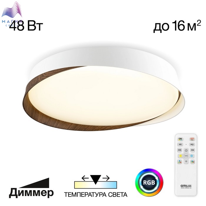 Светодиодный потолочный светильник Citilux BONNY CL754350G. Материал: металл/полимер. Цвет: белый/венге. Мощность изделия 48Вт, световой поток 4100Лм. Пульт ДУ в комплекте (плавная регулировка яркости 10% - 100%, изменение цветовой температуры в диапазоне 3000K - 5500K, многорежимная RGB подсветка).