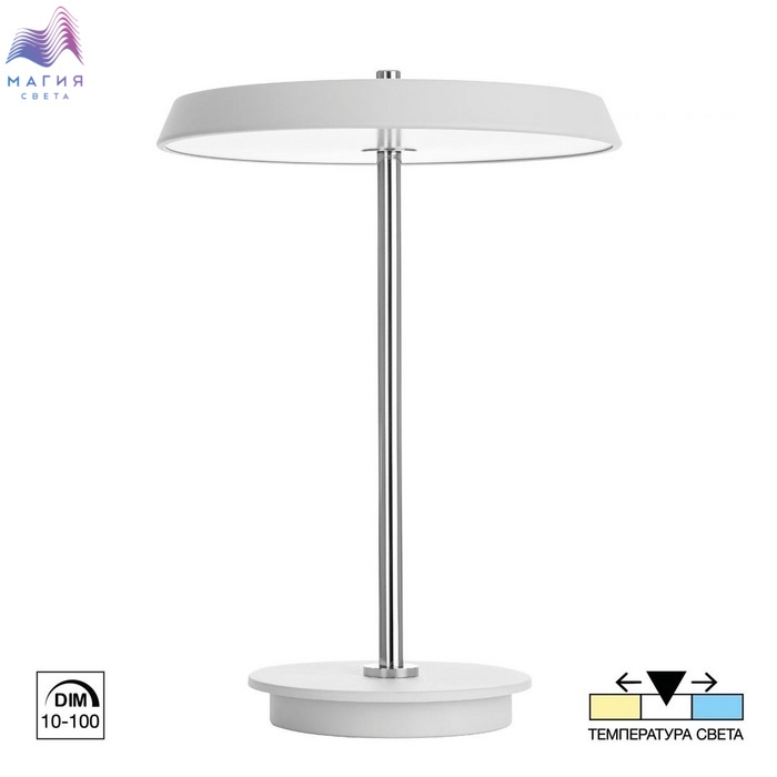 Светодиодная настольная лампа Citilux LINA CL812010. Материал: металл/полимер. Цвет: матовый белый/хром. Плафон - плоский светодиодный модуль, круглой формы с оригинальным усечённым торцом. Диммер с плавной регулировкой яркости от 10 до 100% позволяет выбрать оптимальный уровень освещения. Цветовая температура регулируется, доступны три варианта - 3000-4000-6000К.