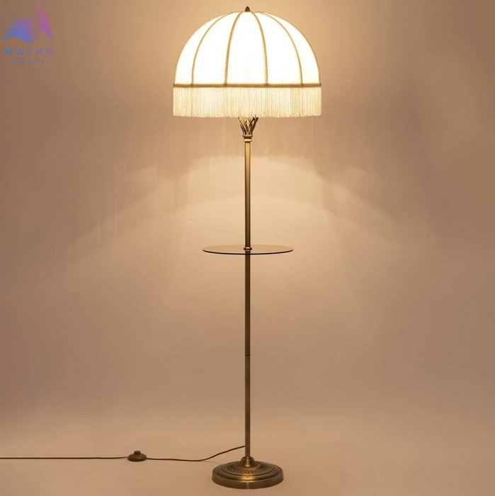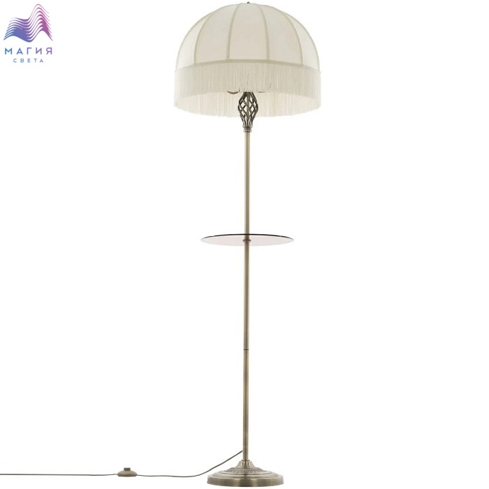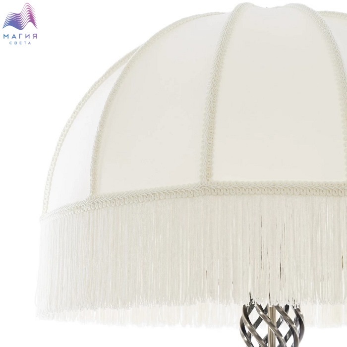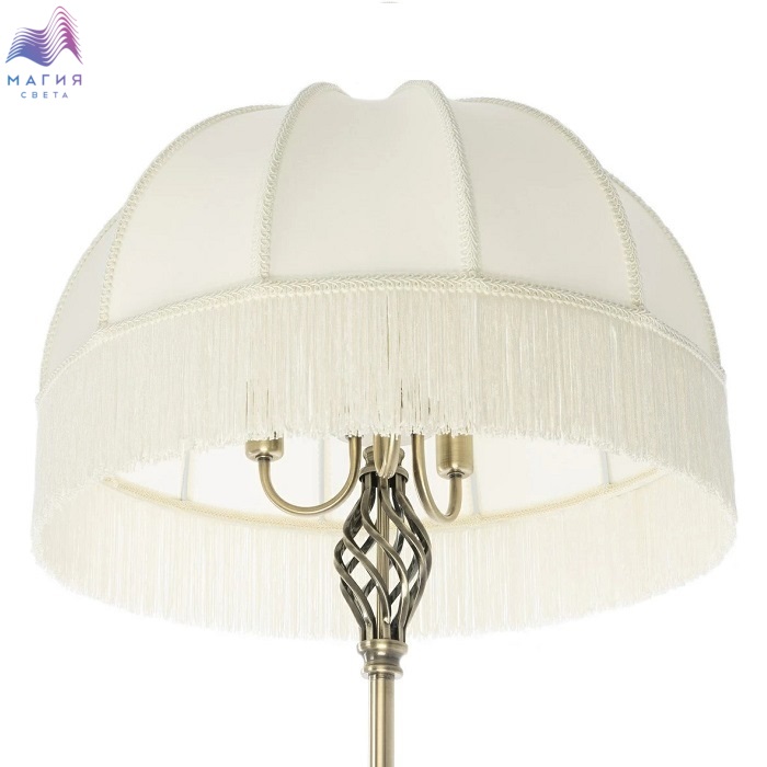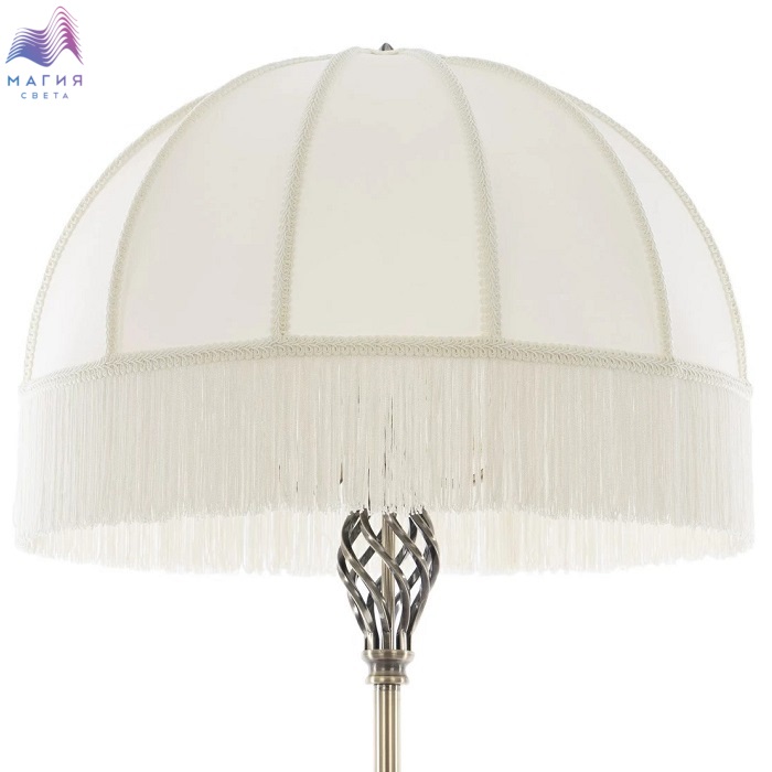 Торшер Citilux Базель CL407931. Материал: металл/текстиль. Цвет: бронза/бежевый. Абажур из гладкой ткани нежно молочного цвета декорирован ажурной тесьмой и обшит бахромой. Сетевой шнур длиной 2м с напольным выключателем.