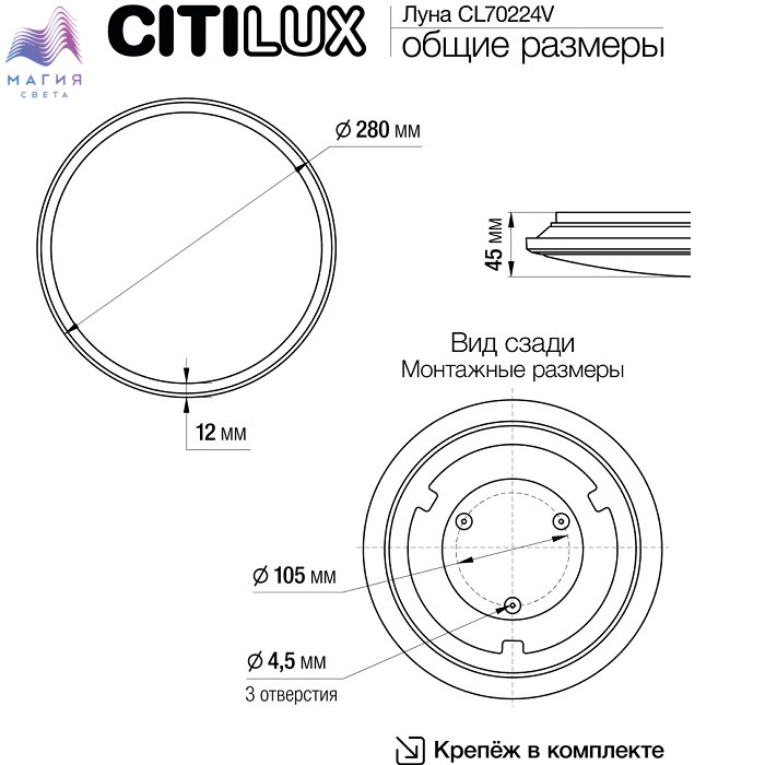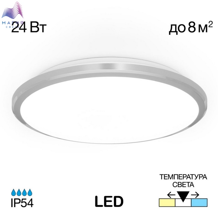 Светильник светодиодный влагозащищённый Citilux Луна CL70224V. Материал: полимер. Цвет: хром/белый. Форма - круг. Класс защиты IP54, осветит до 8м². Модель имеет переключатель цветовой температуры (3000K/4000K/5500K). Переключатель расположен на блоке питания. Доступна регулировка яркости 100-40-15% - управление обычным настенным выключателем.