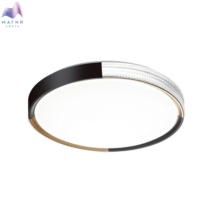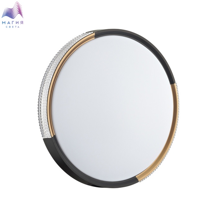 Светильник 7629/ELN серии Сонекс Velio. Материал: металл/пластик. Форма: круг, декор - обод из пластика "под хрусталь" с черным и золотистым элементами декора. Степень защиты IP43. Переключатель температуры цвета (ССT) на драйвере, с помощью которого осуществляется изменение цветовой температуры 3000/4000/6000К.