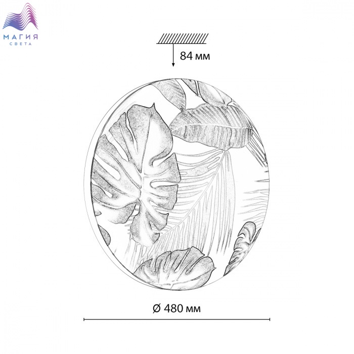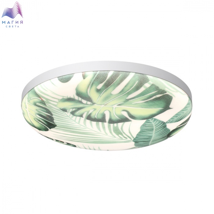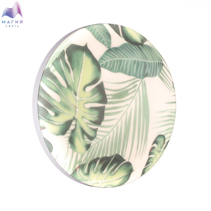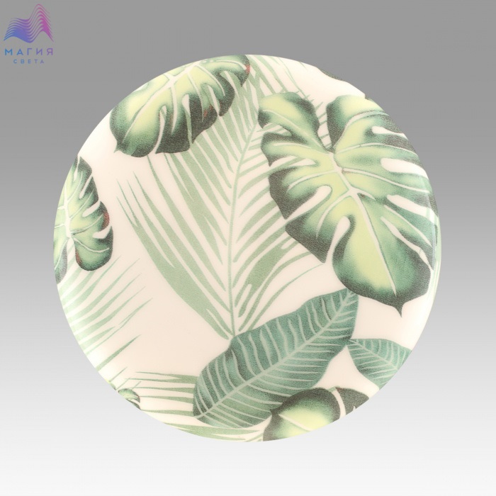 Светильник Сонекс Flori состоит из металлического основания и пластикового рассеивателя. Плафон с зеленым рисунком тропических листьев создает мягкое свечение. Степень защиты IP43.