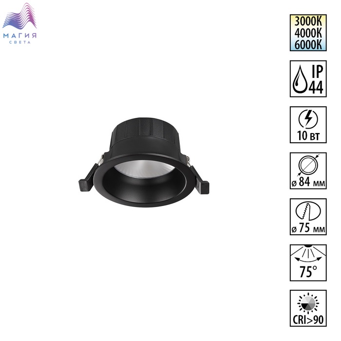 Встраиваемые светодиодные влагозащищённые (IP44) светильники Novotech CLARA с возможностью выбора цветовой температуры — тёплый белый (3000K), нейтральный белый (4000K) и холодный белый (6000K). Доступны в популярных вариантах цвета корпуса: матовый чёрный и матовый белый.