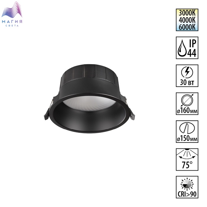 Встраиваемые светодиодные влагозащищённые (IP44) светильники Novotech CLARA с возможностью выбора цветовой температуры — тёплый белый (3000K), нейтральный белый (4000K) и холодный белый (6000K). Доступны в популярных вариантах цвета корпуса: матовый чёрный и матовый белый.