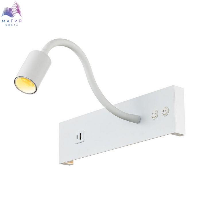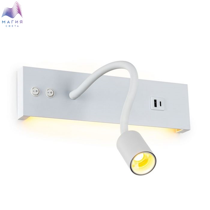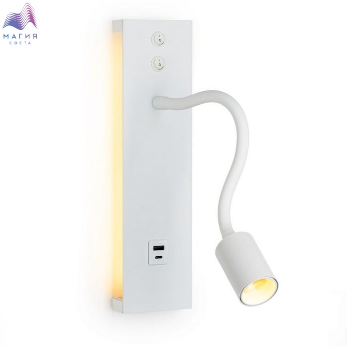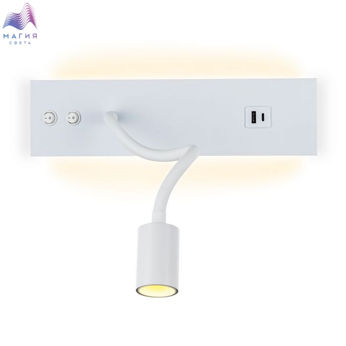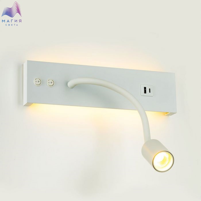 Настенный светодиодный светильник для чтения Citilux Dekart CL704470. Материал: металл, цвет: белый. Фоновая подсветка основания - вверх и вниз, поворотная подсветка на гибкой ножке для чтения. Каждый источник света оснащен отдельным выключателем. Установка светильника возможна в вертикальном или горизонтальном положении с ориентацией вправо или влево. На корпусе расположено зарядное устройство для мобильных устройств, разъёмы USB и Type-C, ток зарядки 1,5А.