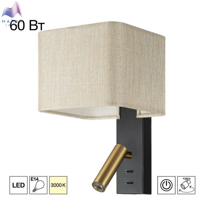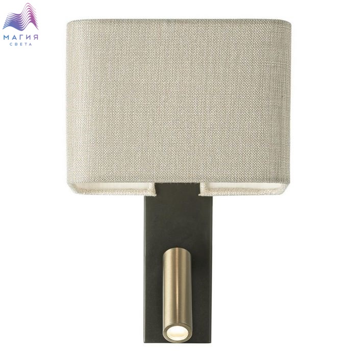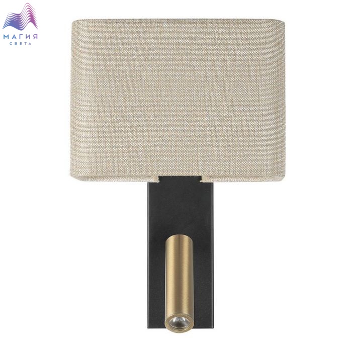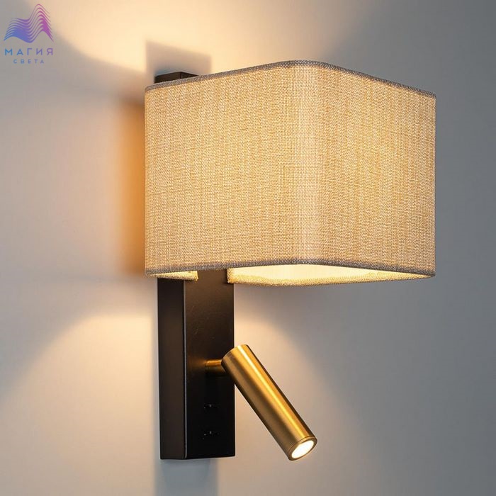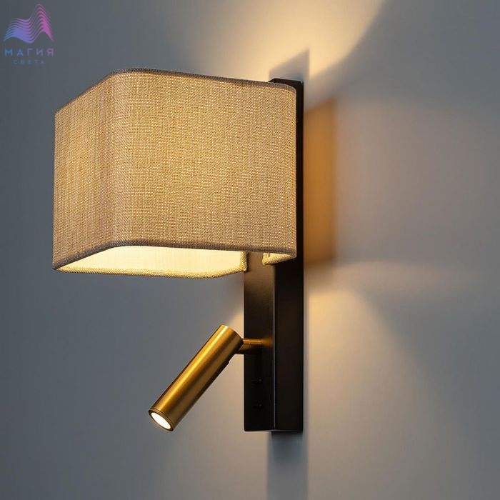 Бра Citilux Dekart CL704483 с абажуром. Материал: металл/текстиль. Цвет: черный/бронза/бежевый. Абажур квадратной формы — из качественного текстиля бежевого (песочного) оттенка. Кроме того, у светильника есть независимый led-модуль для чтения: с бронзовым корпусом, встроенным светодиодом и поворотным креплением. Два выключателя (для основного и дополнительного света) расположены на корпусе.