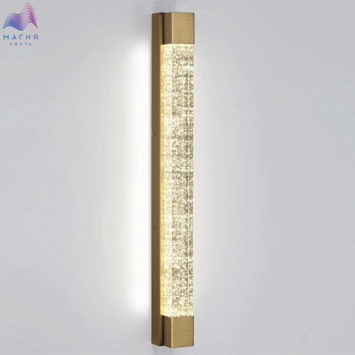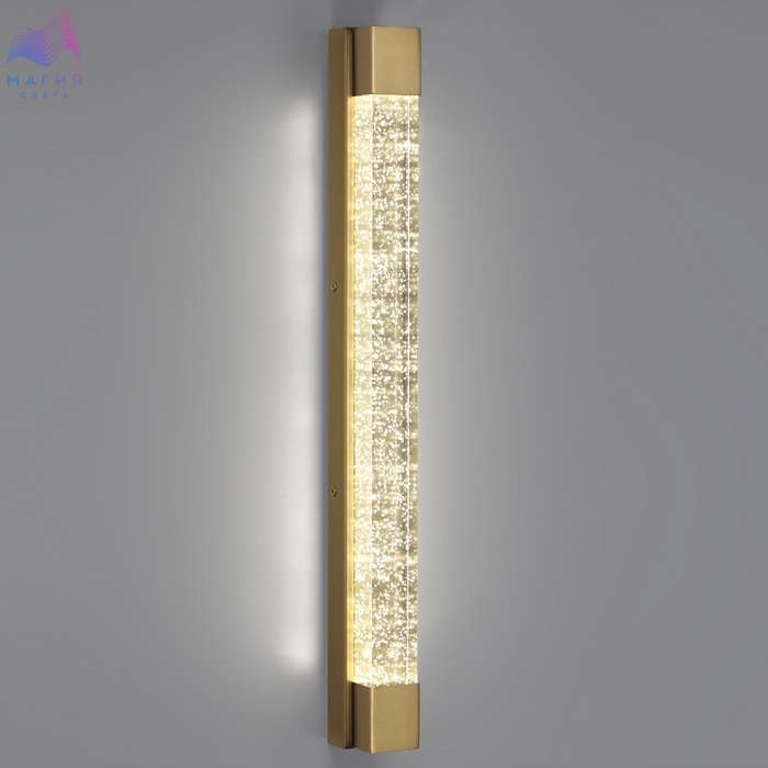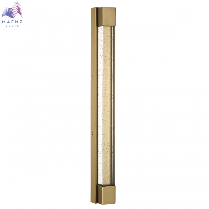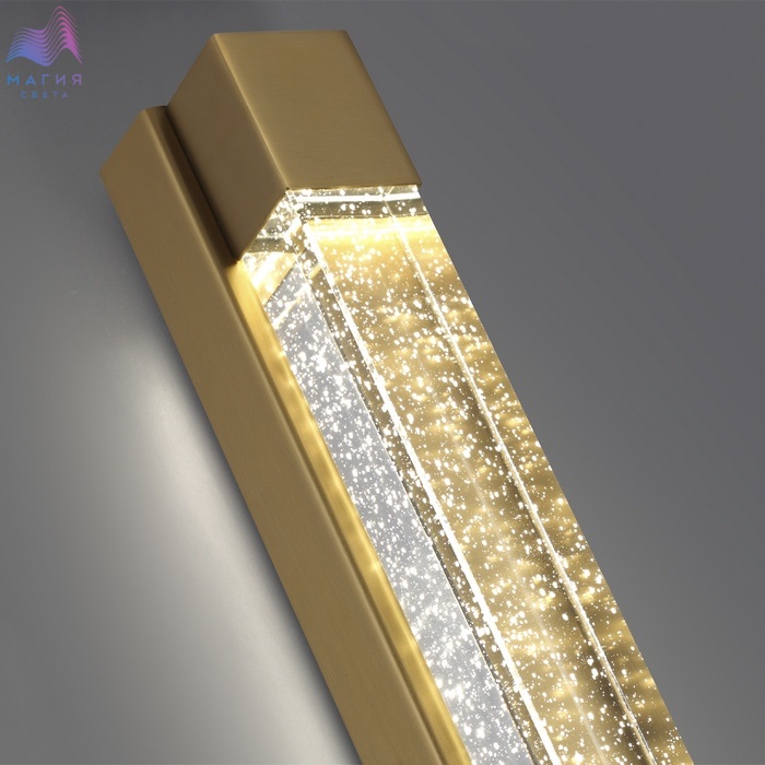 В серии Odeon light Mirada используются в качестве рассеивателя прямоугольные слитки хрусталя с эффектом пузырьков, основание выполнено в двух цветах — латунь и черный брашированный. Свет светодиодов дает роскошное рассеивание в хрустале и обеспечивает игру света в пузырьках. Светильник представлен в цвете античная бронза и темная брашированная латунь.