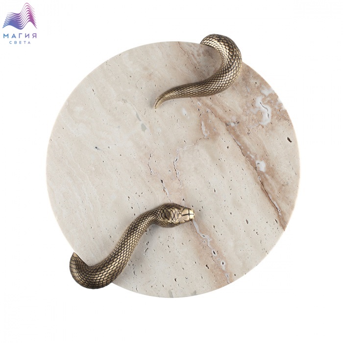 Настенный светодиодный светильник Odeon light Snake дополнен металлической змеей. Плафон выполнен из камня травертина, при этом за счет того, что камень в некоторых местах более тонкий, в этих местах создается необычное эффектное сияние.