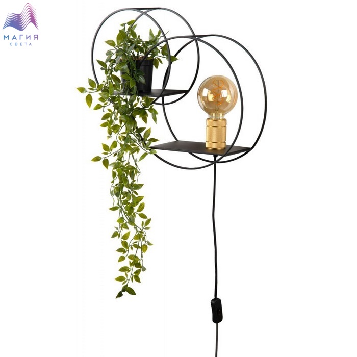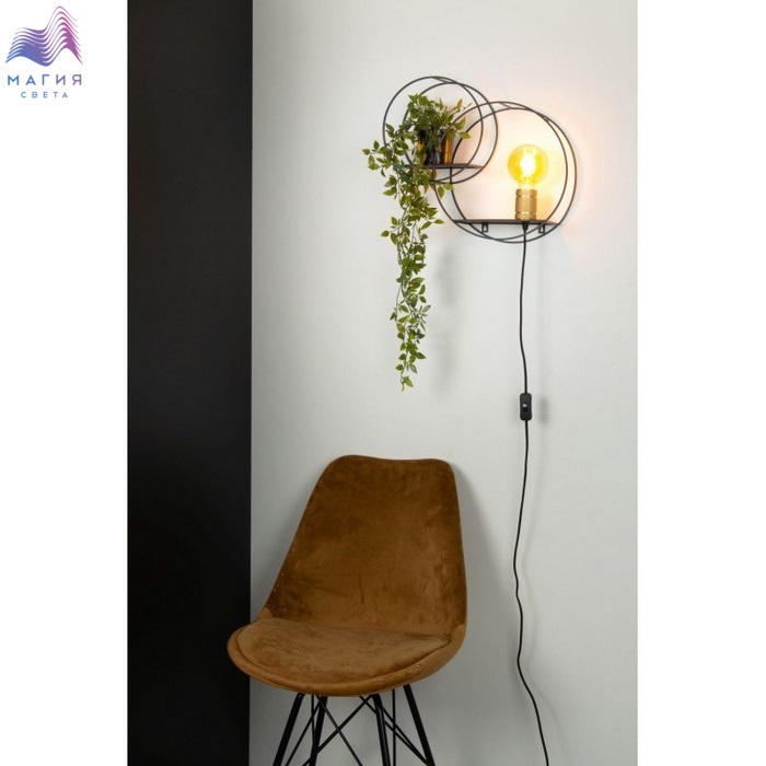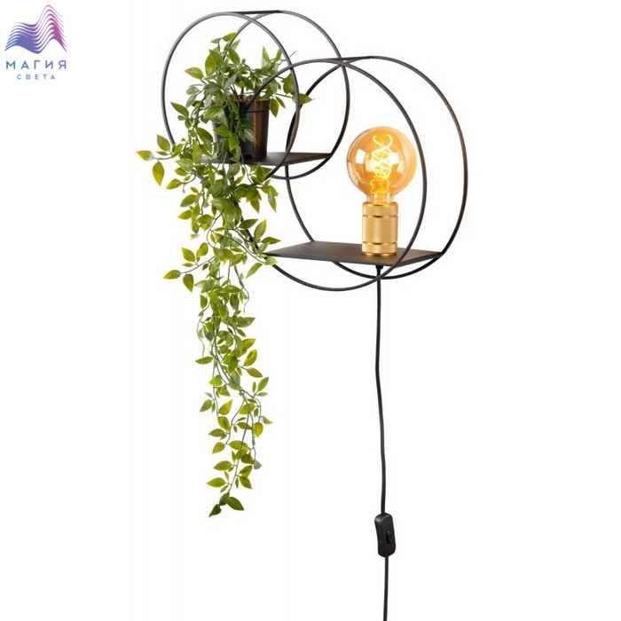 Оригинальный настенный светильник Lucide Circle исполнен в стиле "лофт". Светильник оснащен полками, на которых можно расположить цветы, фоторамку или статуэтки. Лампочка и полки окружены двумя тонкими ажурными кругами. Выключатель расположен на проводе.