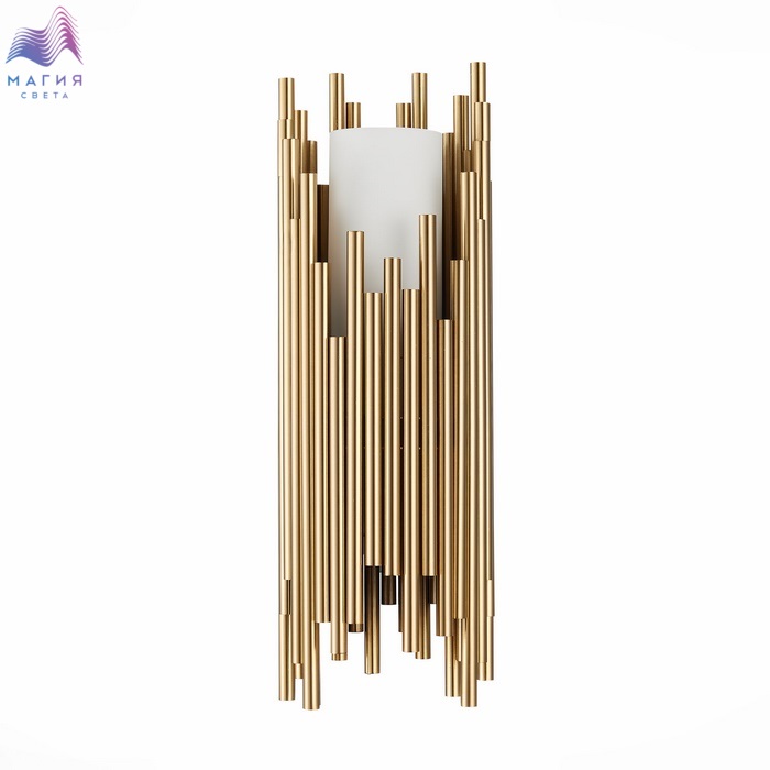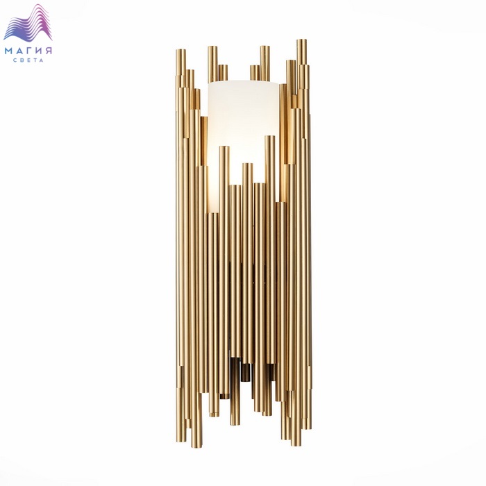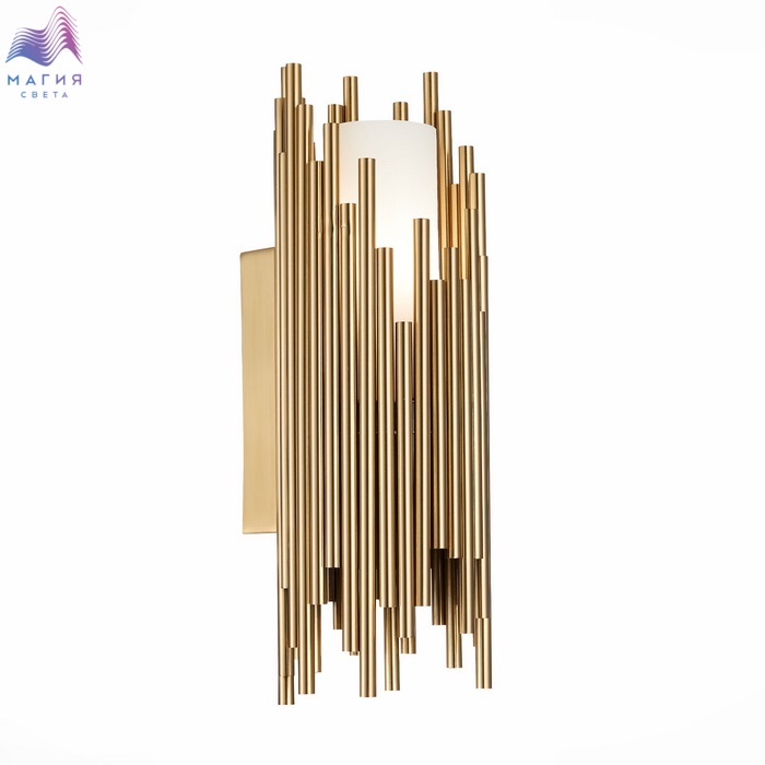 Крупные и оригинальные бра ST luce Cesema точно не останутся незамеченными! Основа изготовлена из множества металлических трубочек, покрытых латунной краской. Артикуо SL1629.301.01 дополнен стеклянным абажуром. Бра идеально подойдут для акцентного освещения и придадут интерьеру атмосферу роскоши.