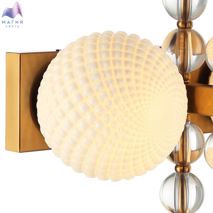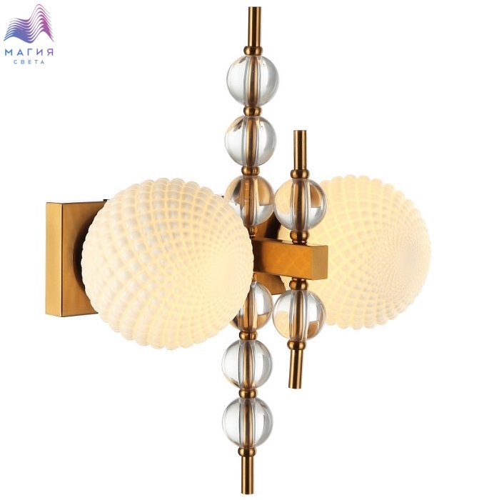 Светильник настенный 2120/03/01W Stilfort серии Queenly выполнен в стиле модерн. Арматура изготовлена из окрашенного металла в цветовом исполнении "латунь". Плафон стеклянный, белого цвета. Светильник украшен декоративными стеклянными элементами.