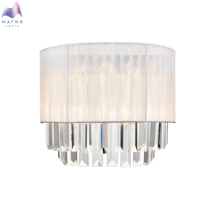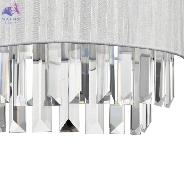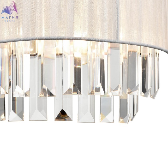 Серия Vele Luce Fata чарует своим дизайном. Плафон изготовлен из текстильной ленты белого цвета, которая обрамляет металлический каркас. Хрустальные подвески расположены в центральной части светильников. Длину цепи у подвесной люстры можно отрегулировать при монтаже.