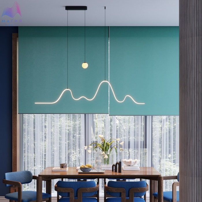 Светильник Odeon light Moonlight похож на силуэт горы, словно подсвеченный лунным светом от шара из настоящего алебастра. Волнистая линия с Led источником света 3000K дает свет вниз, светильник может использоваться над островом или вытянутым пространством.