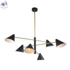 Люстры и бра серии F-promo Trikonoya полностью изготовлены из металла. Строгий каркас матового черного и золотого цветов кажется невесомой. Конусообразные плафоны направляют свет вниз.