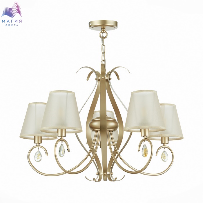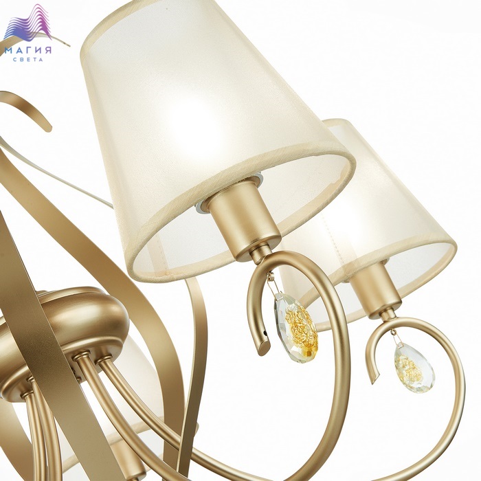 Серия Evoluce Foggia понравится ценителям изысканной классики. Тонкие металлические рожки декорированы стеклянными подвесками. Арматура покрыта краской цвета "шампань", которая гармонично сочетается с текстильными бежевыми плафонами.