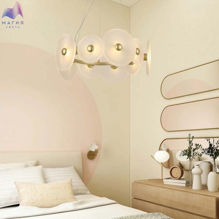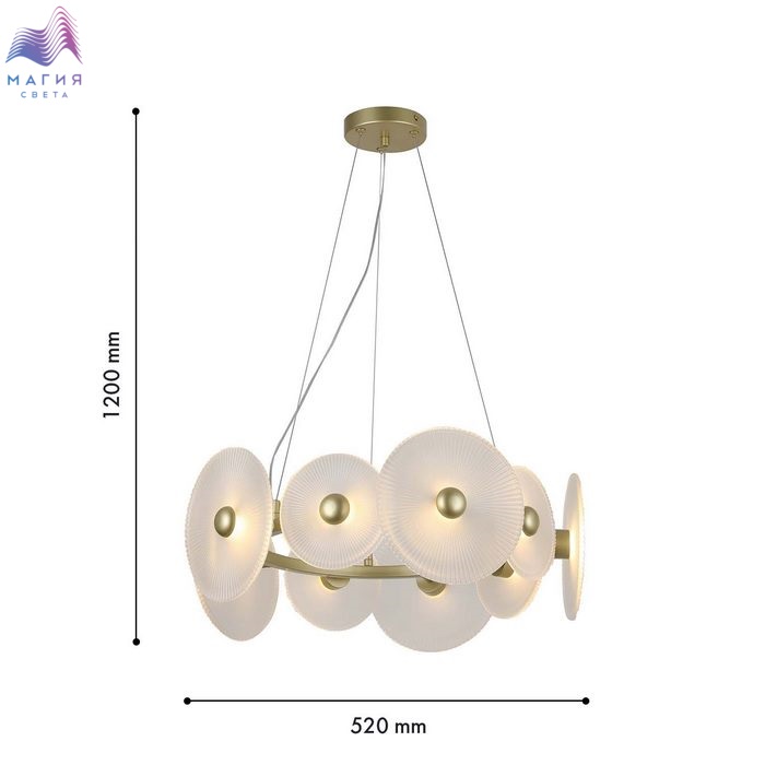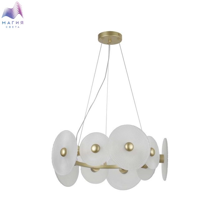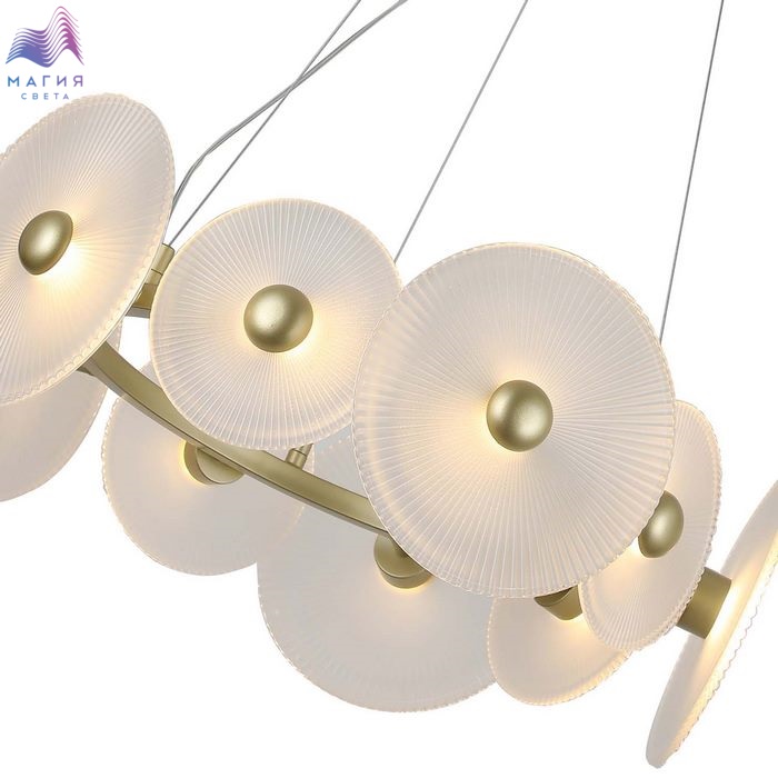 Мягкие формы и элегантный дизайн - типичные черты коллекции F-Promo Arctium. Каркас золотого цвета дополнен стеклянными дисками, за которыми расположены LED-модули. Каждый диск дополнен декоративным элементом золотого цвета.