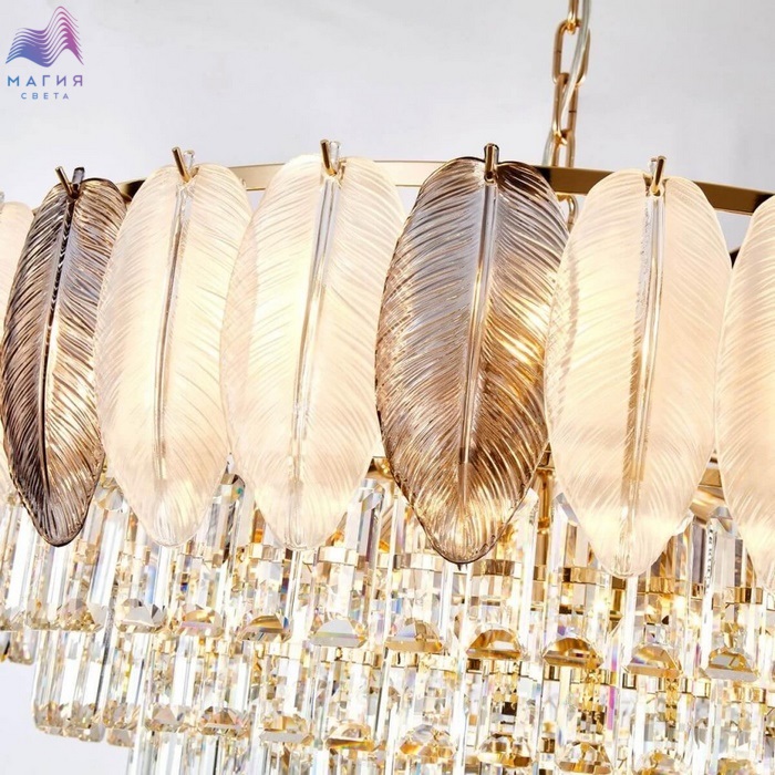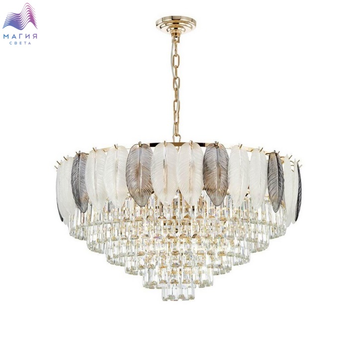 Коллекция Favourite Dolor исполнена в классическом стиле. Металлическое основание золотого цвета. Плафон состоит из листков, изготовленных из белого и серого стекла. Хрустальные детали обильно украшают светильники.