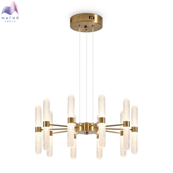 Серия Freya Alias состоит из двух вариантов люстр. Цвет металла — латунь и никель. Основной акцент в дизайне сделан на акриловые плафоны с эффектом пузырьков: они мягко рассеивают свет и создают лёгкую игру бликов. В качестве источника света используются встроенные LED-модули.